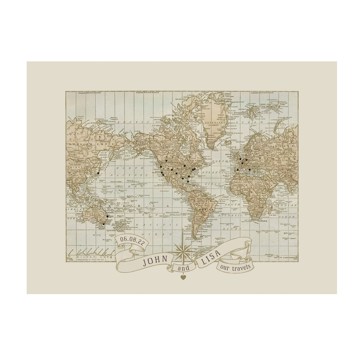 Personalized Wedding Anniversary Push Pin World Map | Wendy Gold