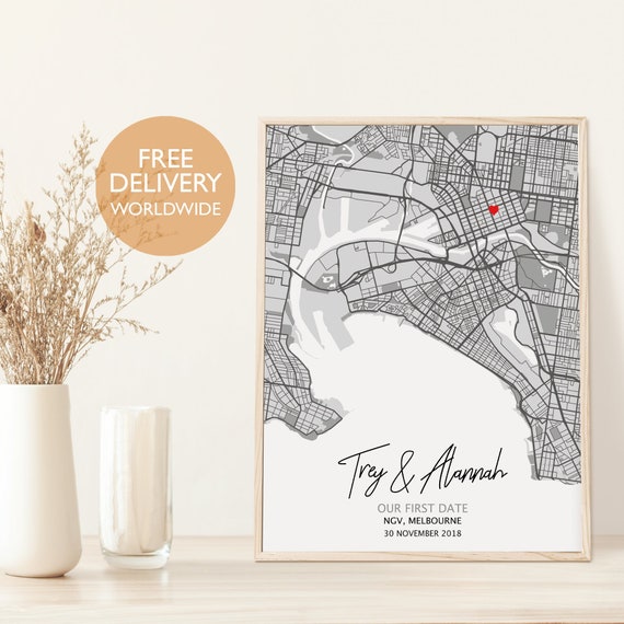 First Date Gifts Map Print, Personalized First Anniversary Gift
