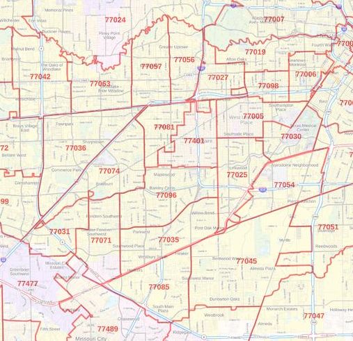 Houston Texas 5 Digit Zip Code Maps Red Line