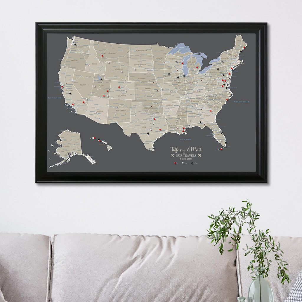 Earth Toned US Travel Map | Framed US 50 States Map Push Pin